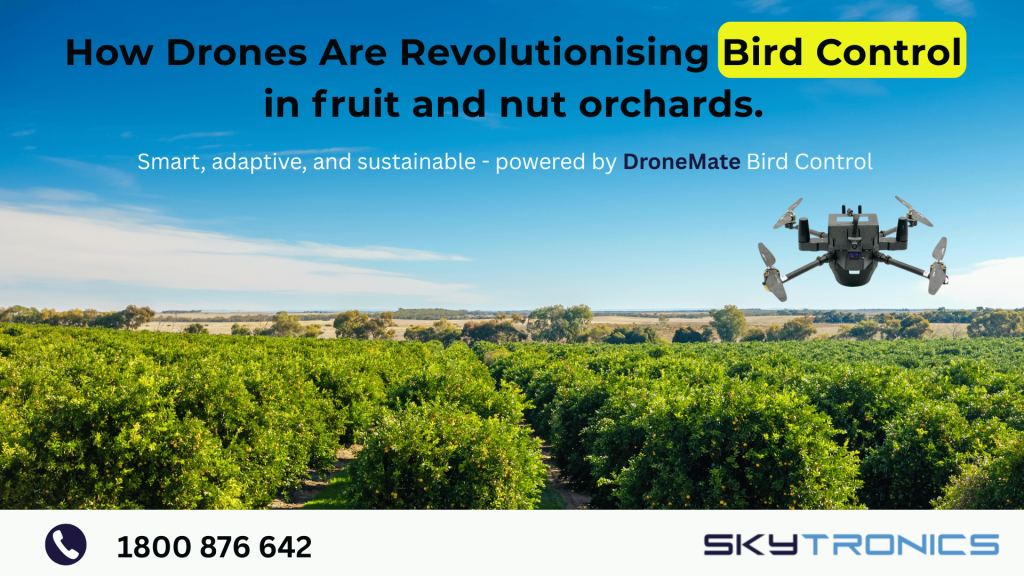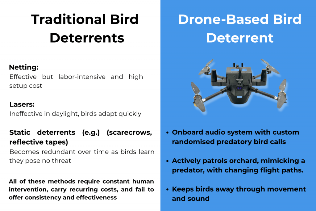 Meet DroneMate — an intelligent drone-based bird deterrent system designed specifically for nut and orchard farms.